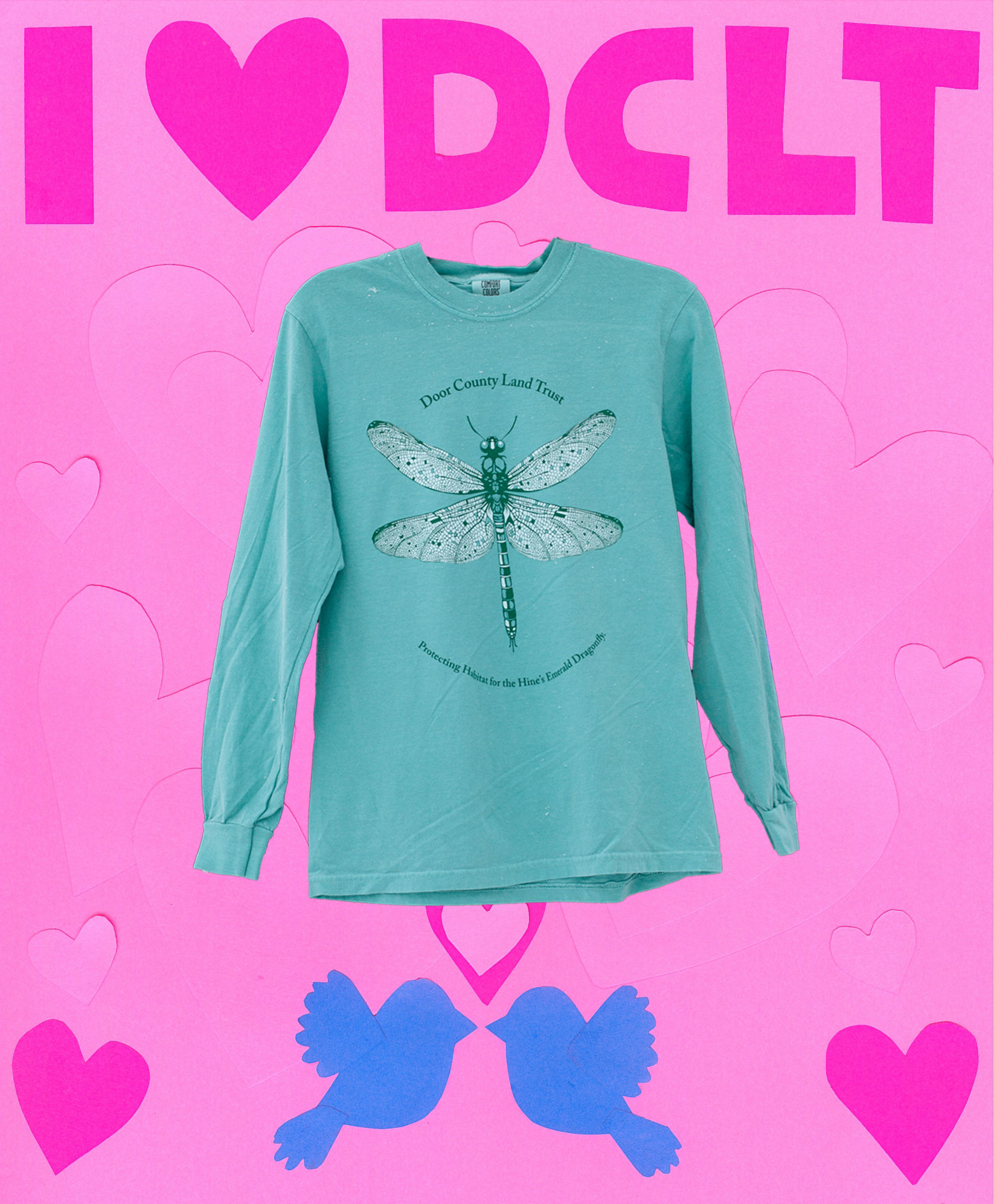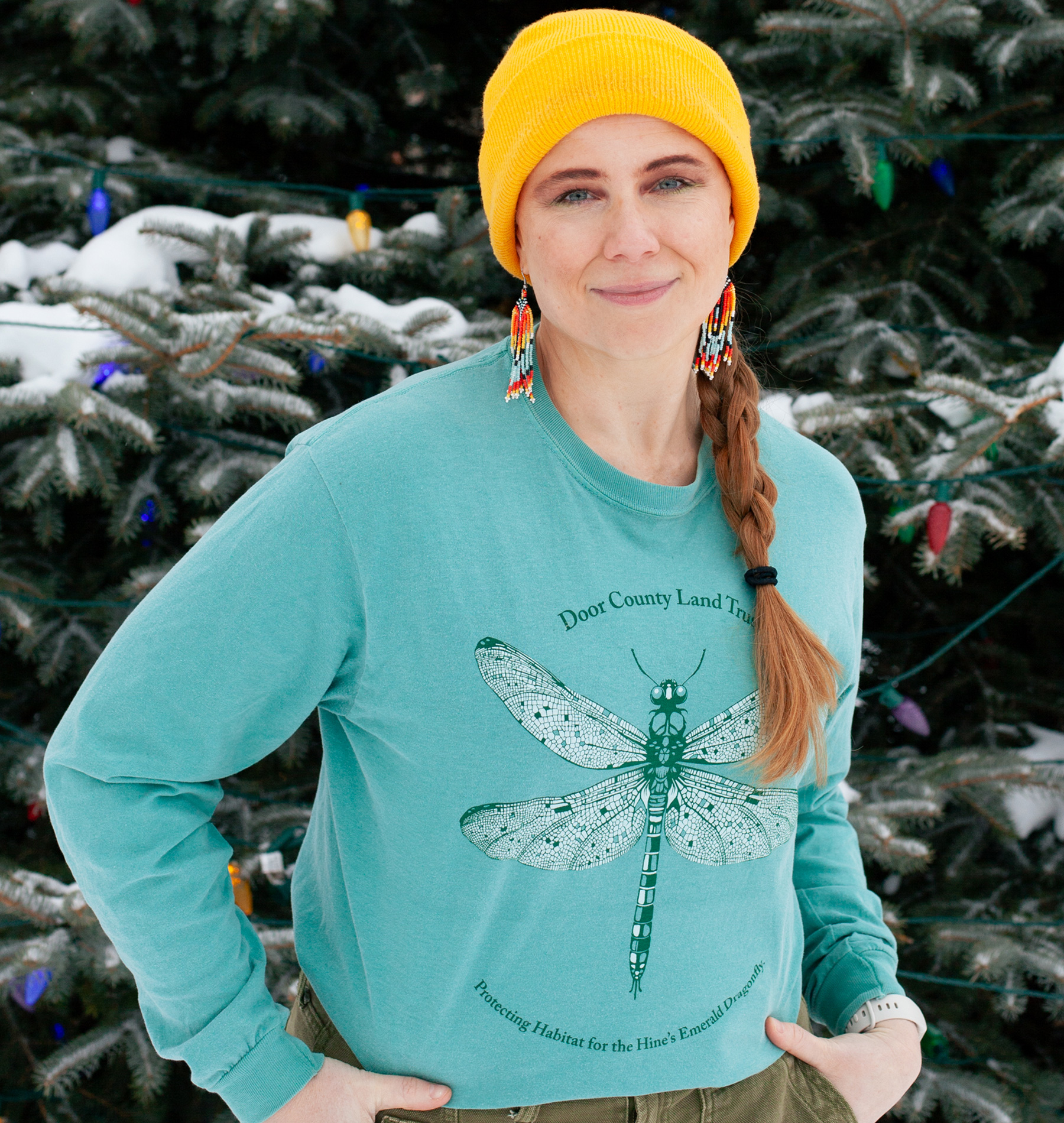 These long sleeve tees feature the endangered Hine’s emerald dragonfly, of which an estimated two-thirds of the world’s entire population lives in Door County! The Land Trust protects hundreds of acres of critical wetlands where these rare dragonflies live, such as Three Springs Nature Preserve. These tshirts are made with 100% heavyweight cotton and printed with eco-friendly water-based inks. The garment-dye process gives the shirt a vintage feel. Unisex sizing.