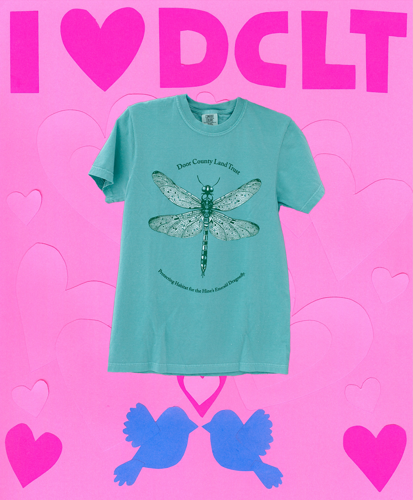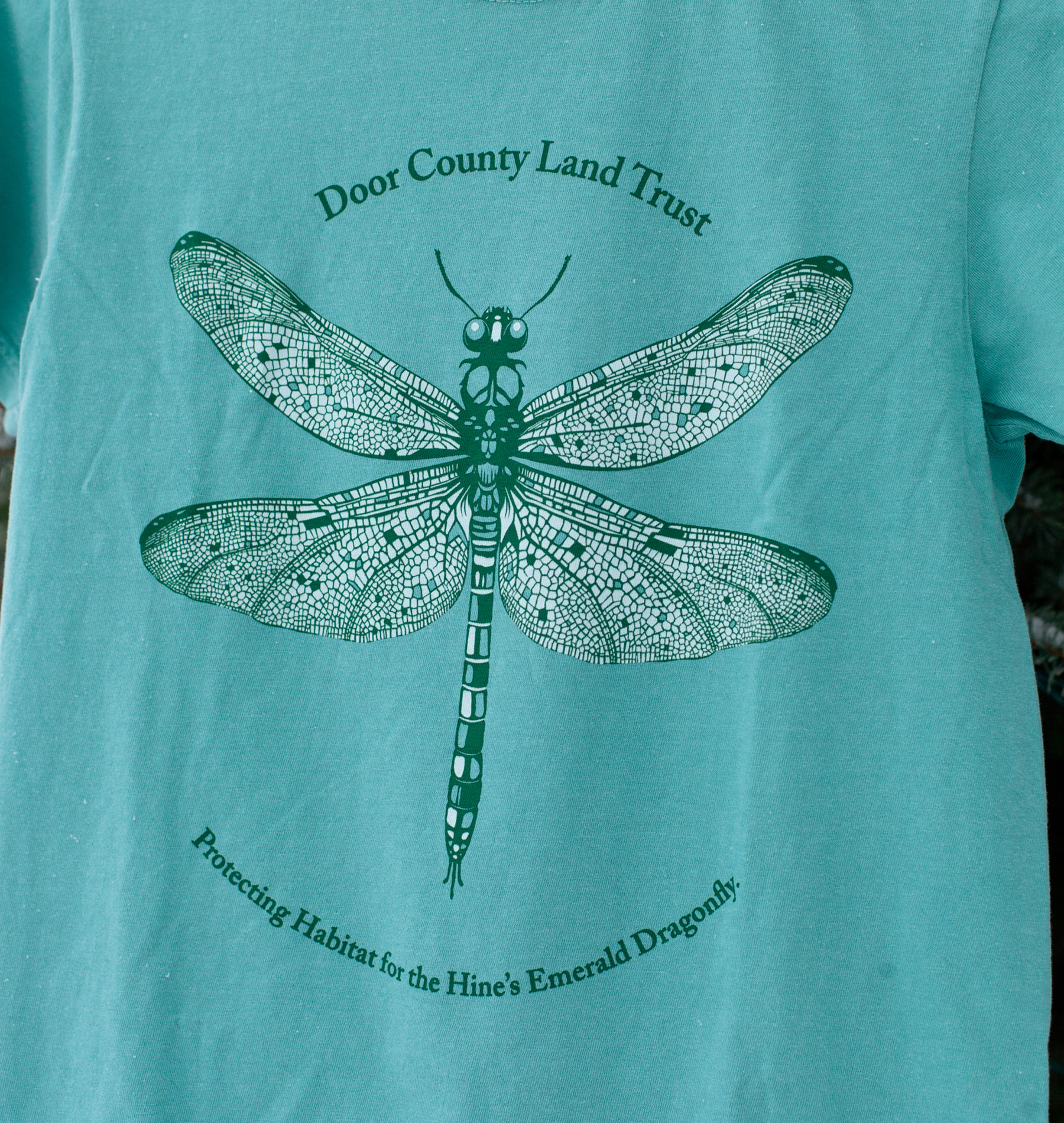 Our new shirts feature the endangered Hine’s emerald dragonfly, of which an estimated two-thirds of the world’s entire population lives in Door County! The Land Trust protects hundreds of acres of critical wetlands where these rare dragonflies live, such as Three Springs Nature Preserve. These tshirts are made with 100% heavyweight cotton and printed with eco-friendly water-based inks. The garment-dye process gives the shirt a vintage feel. Unisex sizing.